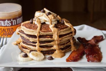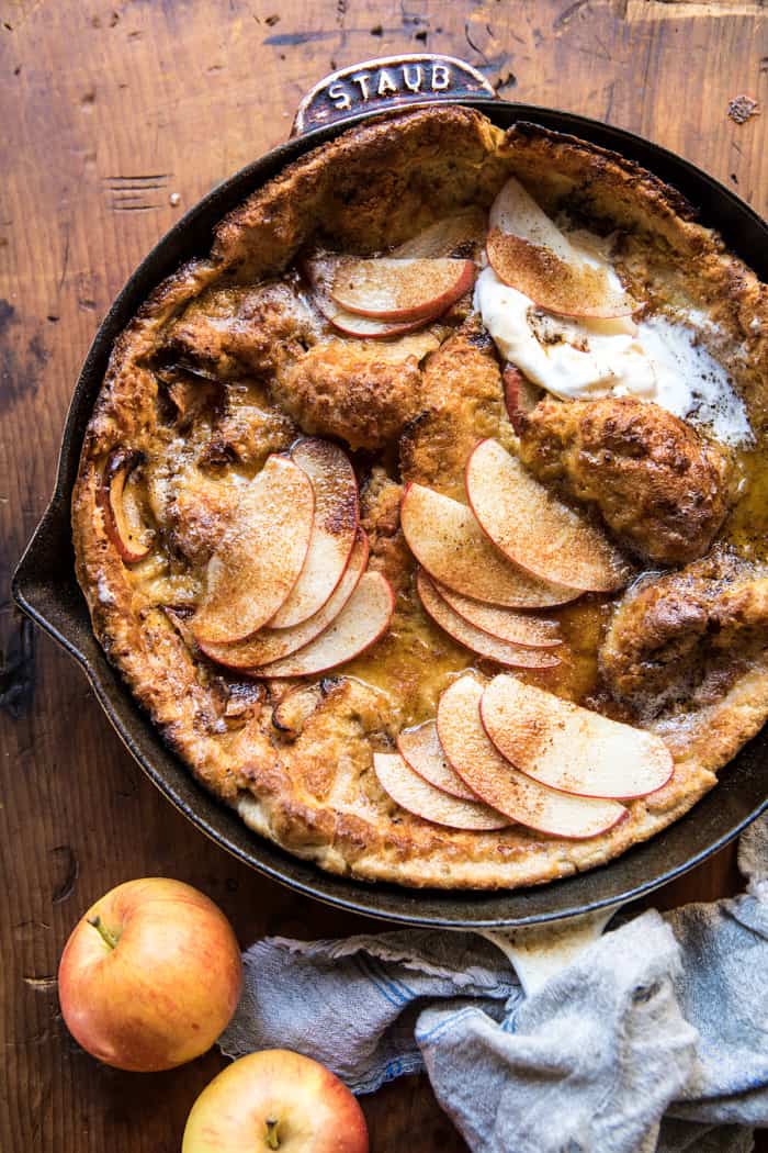 Remove the Dutch baby from the oven and serve topped with the remaining apple slices, whipped cream, and cinnamon syrup.